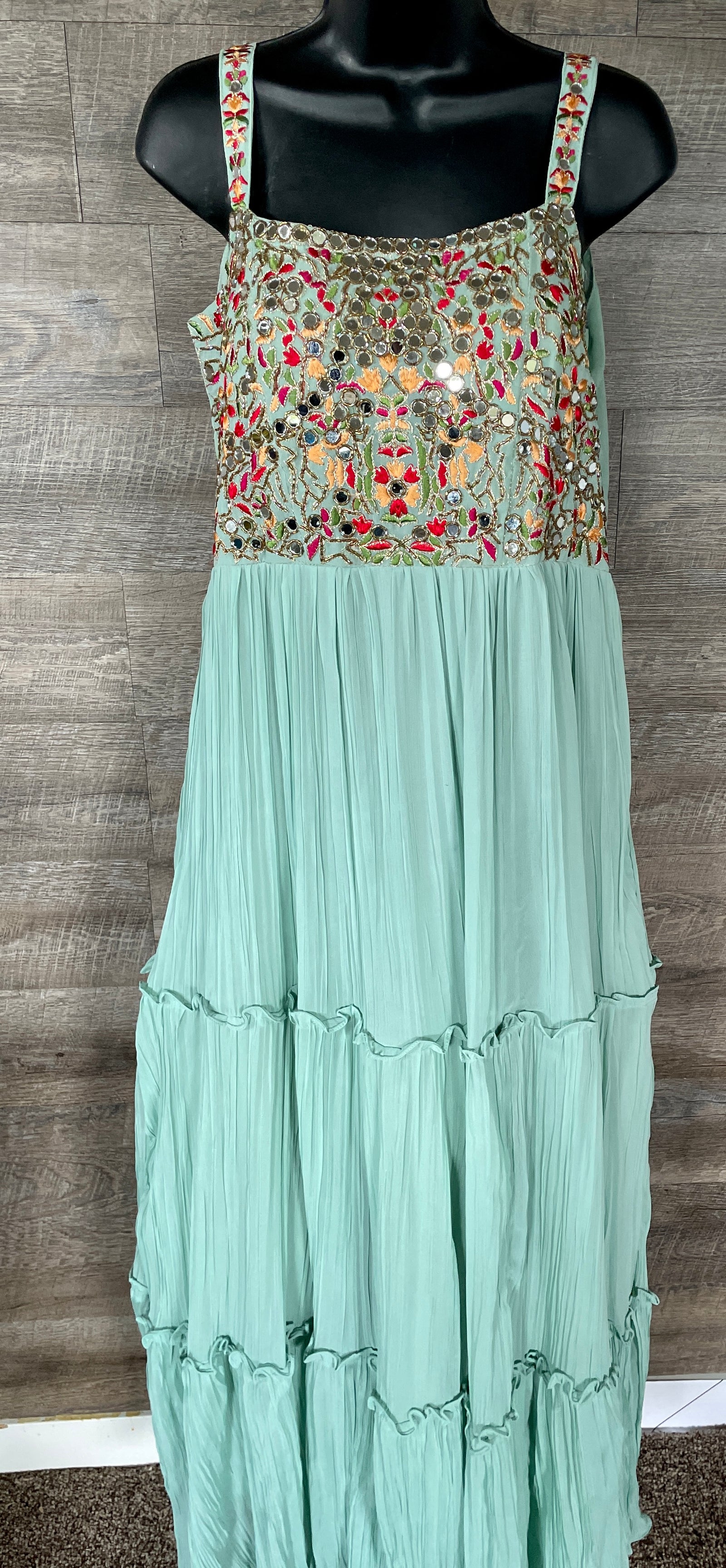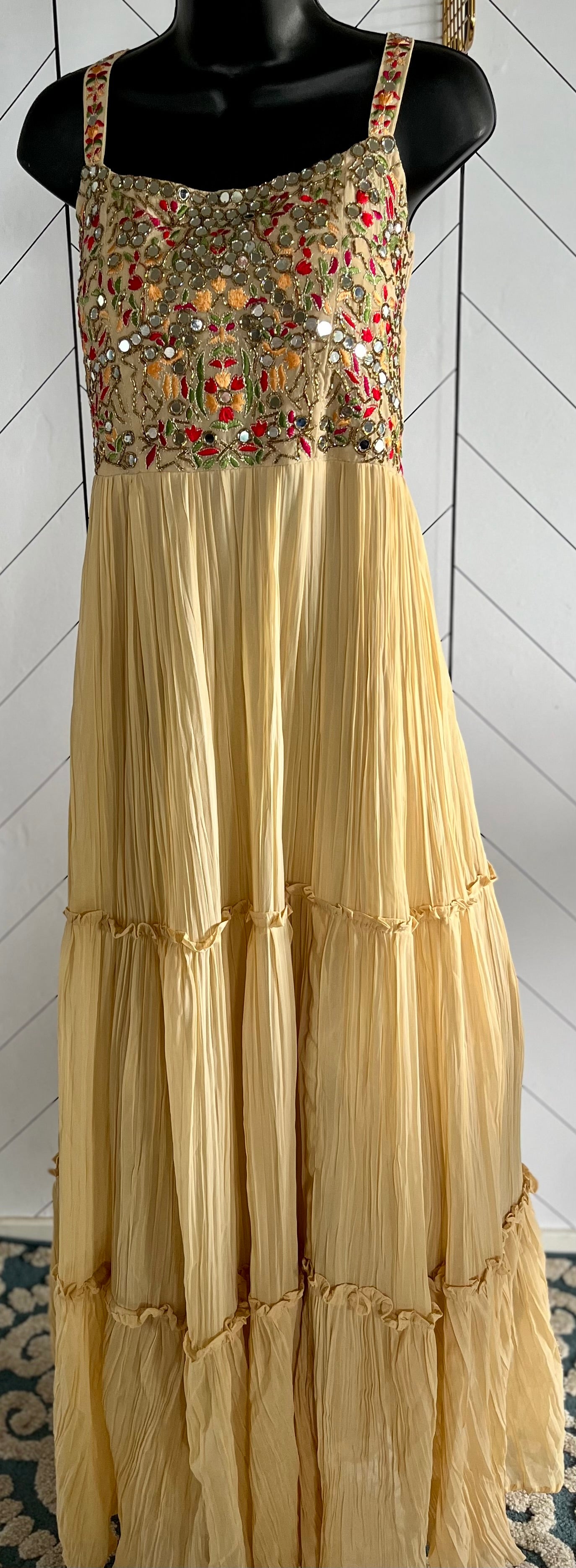 STK147-Pure Designer Georgette Crush Embroidery Mirror Work Long Dress with Pant and Dupatta(Sleeves attached inside)