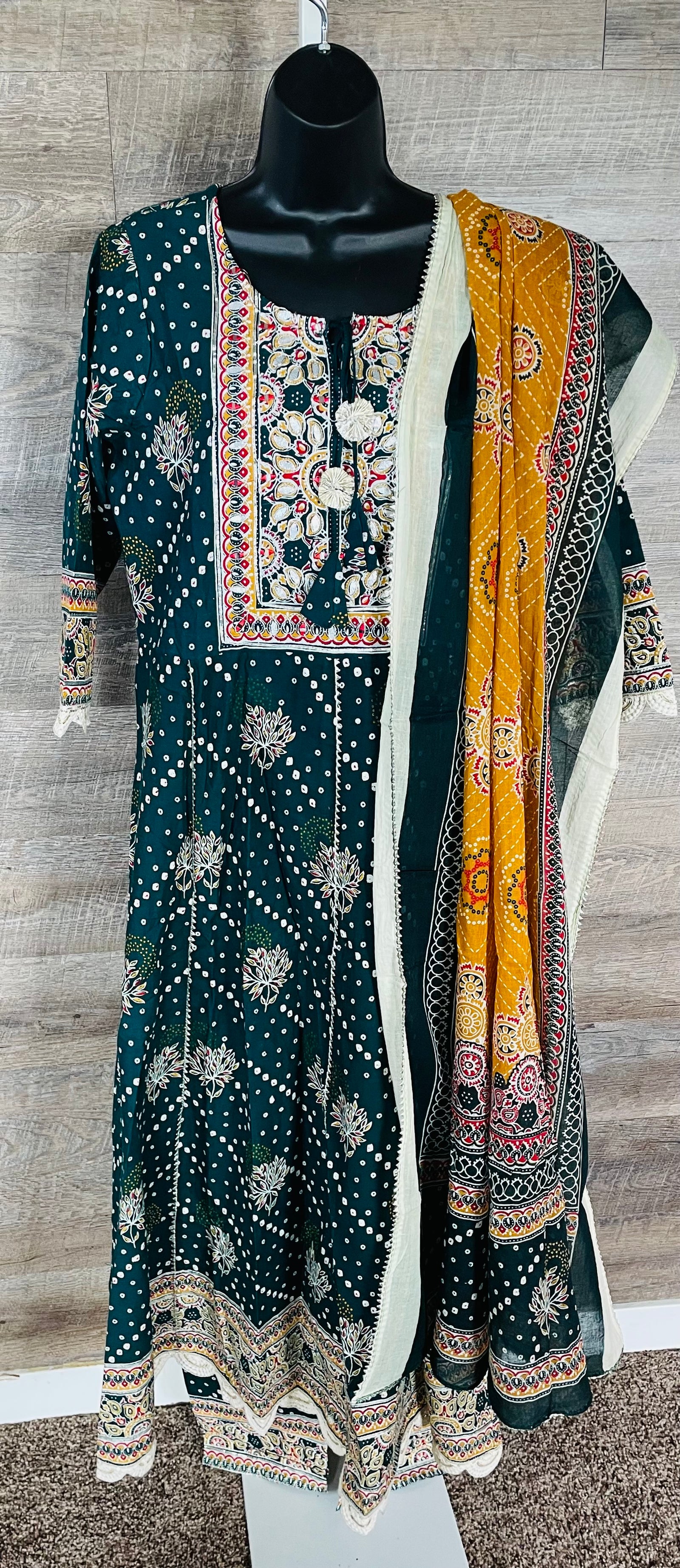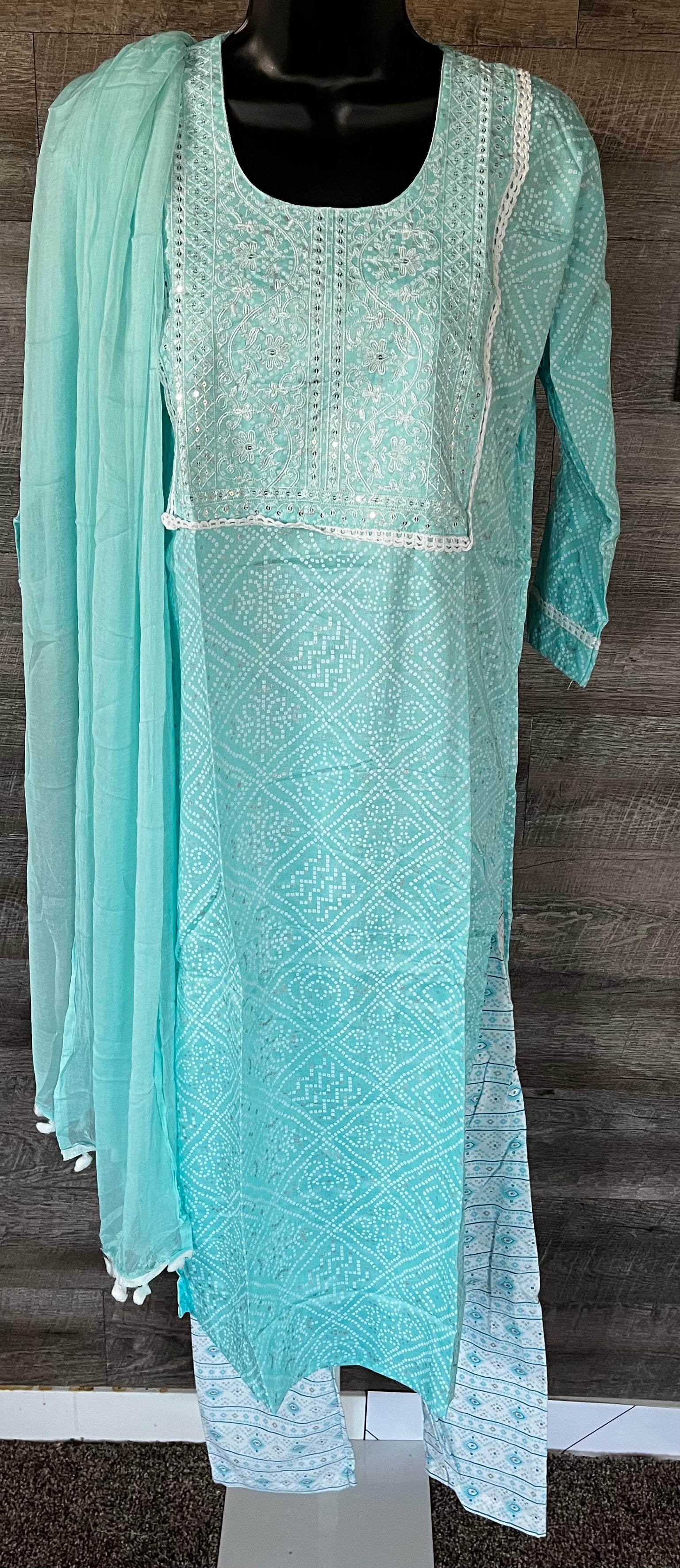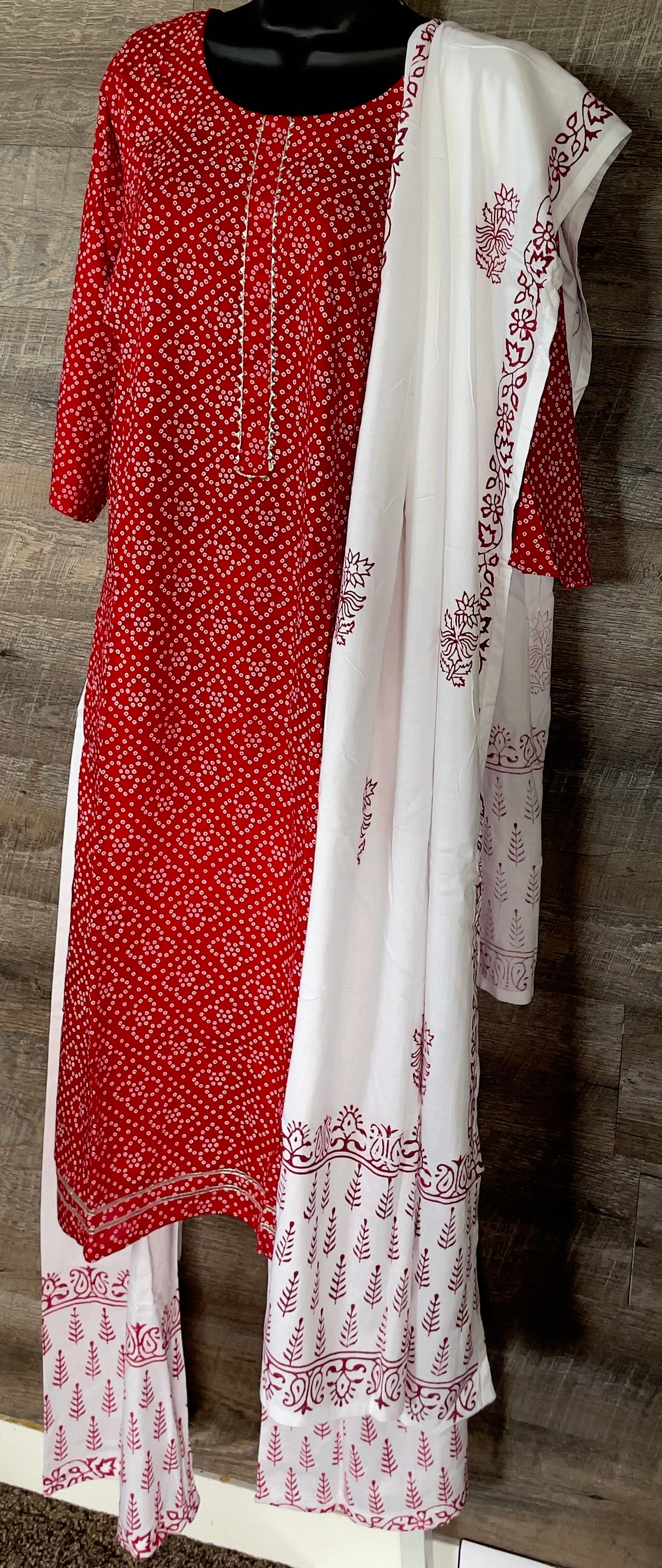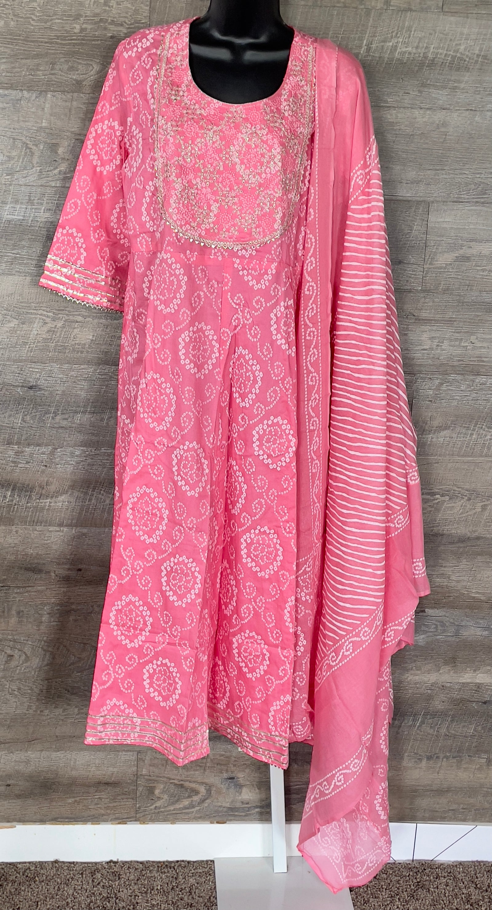STK156-Pure Designer Cotton Embroidery Bandhani Kurti with Pant and Dupatta