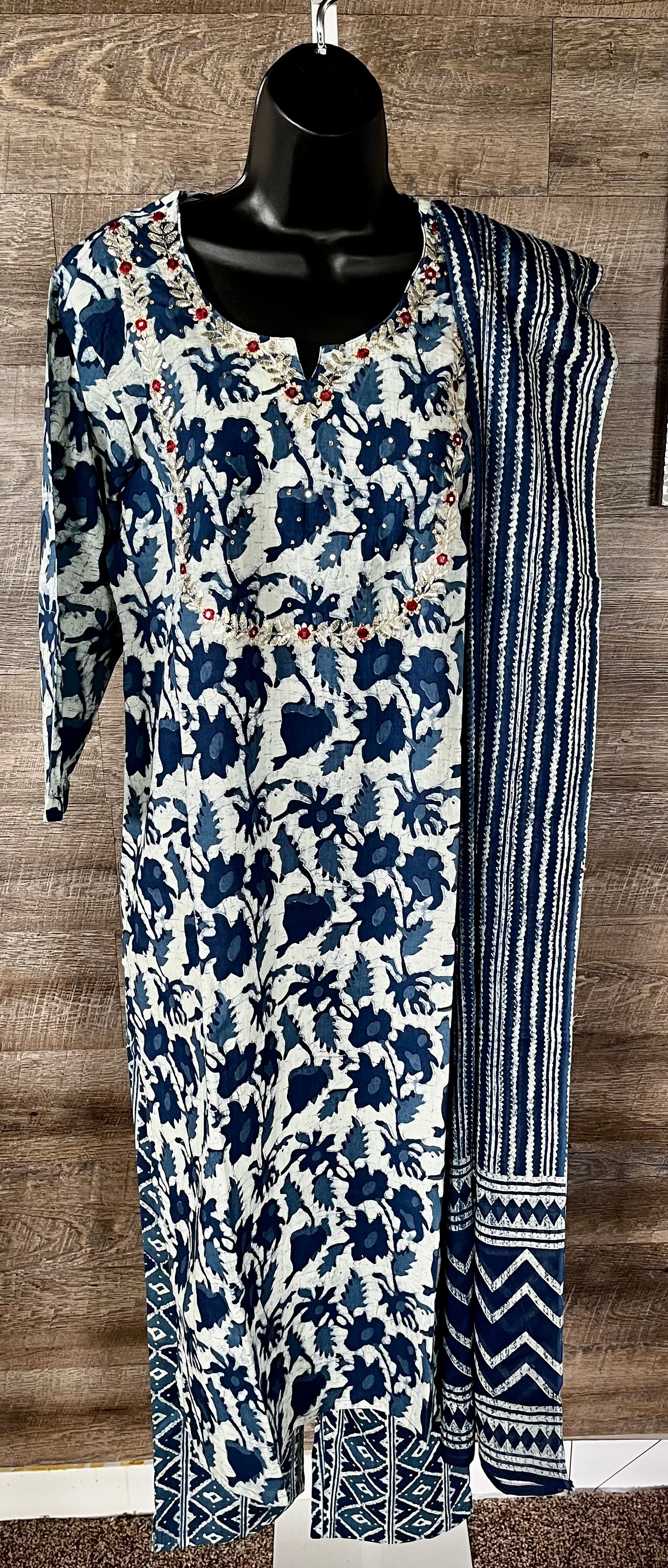 STK175-Pure Designer Muslin Cotton Embroidery Foil Mirror Thread Work Kurti with Pant and Dupatta